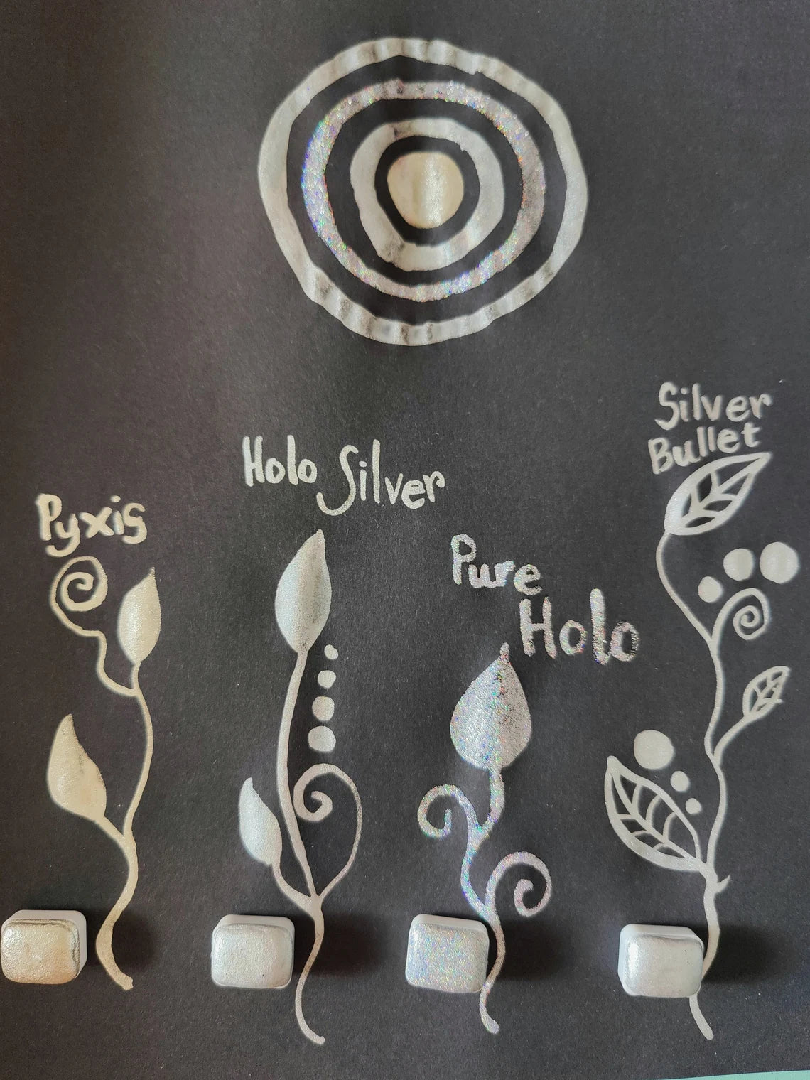 Their names are: Pyxis (warm silver chrome pigment), Holo Silver (silver holographic pigment), Pure Holo (fine holographic glitter), Silver Bullet (cool silver chrome pigment).