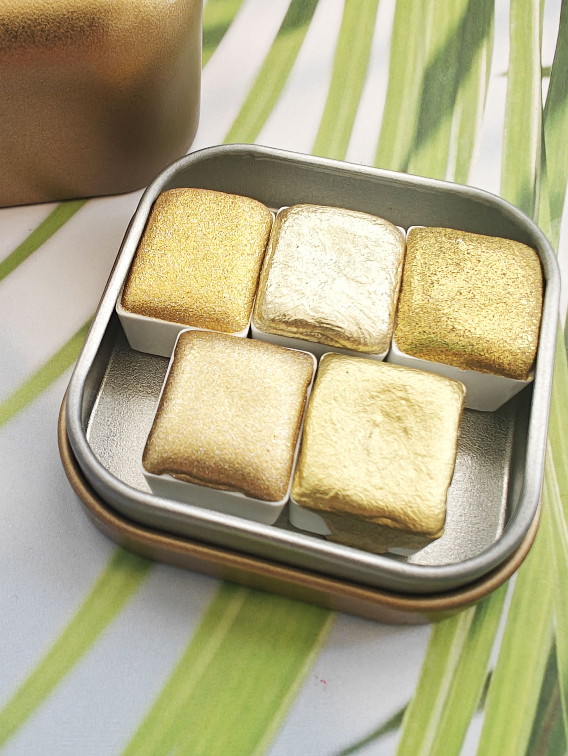 Set da 5 acquarelli da 1/2 panetto toni oro dorati metallizzati olografici "You are Golden Set"